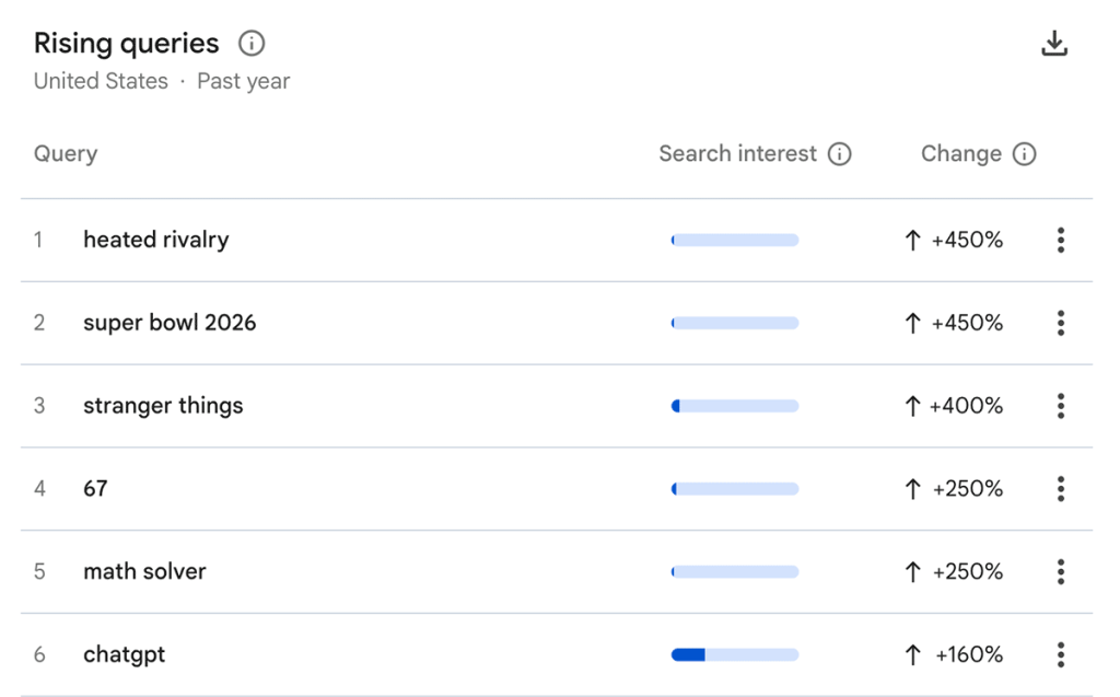 Unlike traditional keyword tools that emphasize historical volume, Google Trends also highlights momentum.