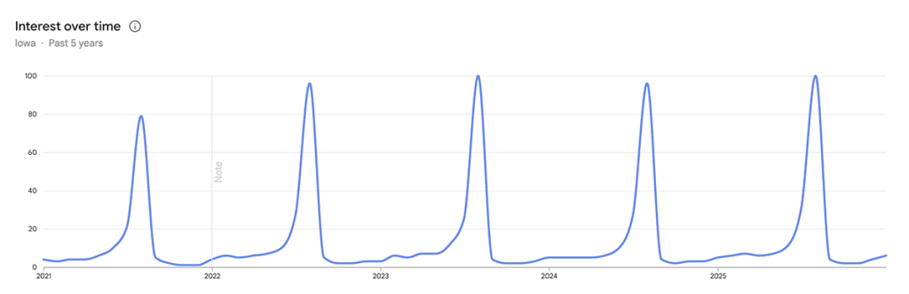 Many high‑performing content topics are seasonal, and Google Trends makes this pattern obvious.