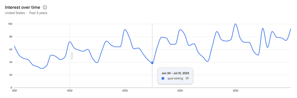 Interest in “goal setting” often spikes in January, while plummeting sharply in July. Smart marketers align publishing schedules to these patterns instead of reacting late.